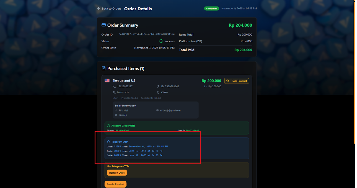 On the product page, click "Request OTPs" to trigger the code, then click "Get Telegram OTPs" to display the incoming OTP.